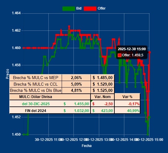 📌📉15,00 Hs Cierre 2025 del MULC entre Bancos – Dólar Divisa Bid 1452,00 – Offer 1459,50. Termina con un Volumen genuino de USD 216,46 millones ¿Como cotizan para el VIE 02-ENE y LUN 06-ENE-2026?