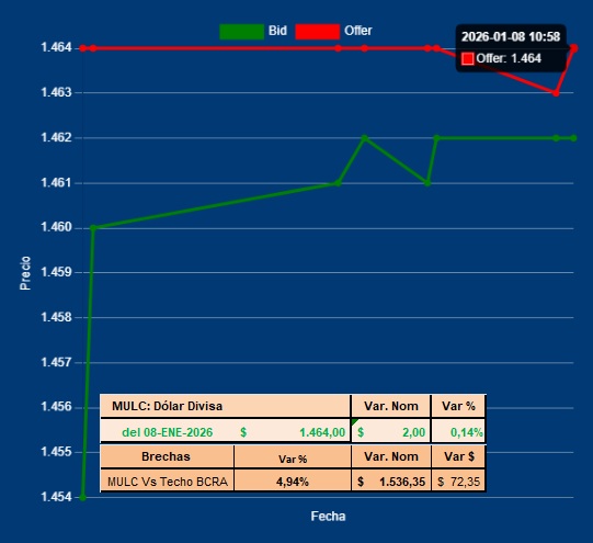 📌📈 🔁11,00 Hs Cotización del MULC entre Bancos – Dólar Divisa Bid 1462,00 – Offer 1464,00. Con la sorpresiva Baja de ayer sobre el final del MULC, a priori estamos detectando un cambio de tendencia. Sugerencia Cambiaria:
